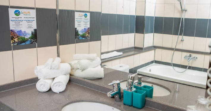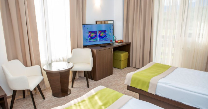 Spatii de cazare - amenajate modern, toate dispunand de terasa cu mobilier, TV LCD/LED cu diagonala de 108 cm, baie cu cada sau cabina de dus, uscator de par, cosmetice hoteliere, halate si papuci, seif si minibar.