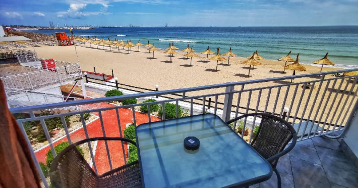 Camerele duble (vila 1 si vila 2) sunt dotate cu un pat matrimonial (180x220) si o canapea extensibila (160x200). Suprafata 25 mp. Pot avea balcon francez sau balcon normal si se afla atat pe parter cat si pe etaj. Au vedere frontala la mare.