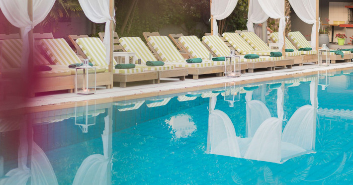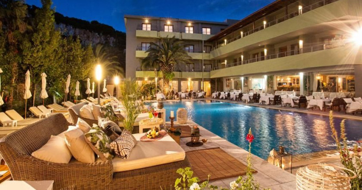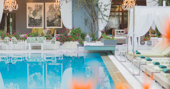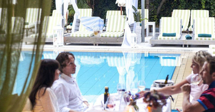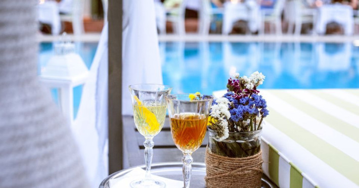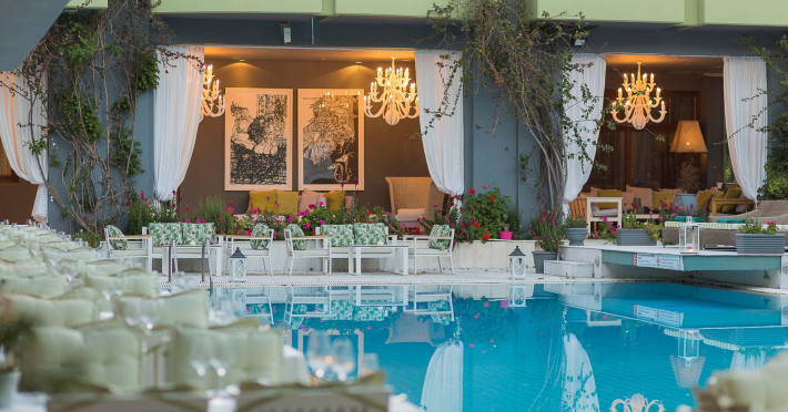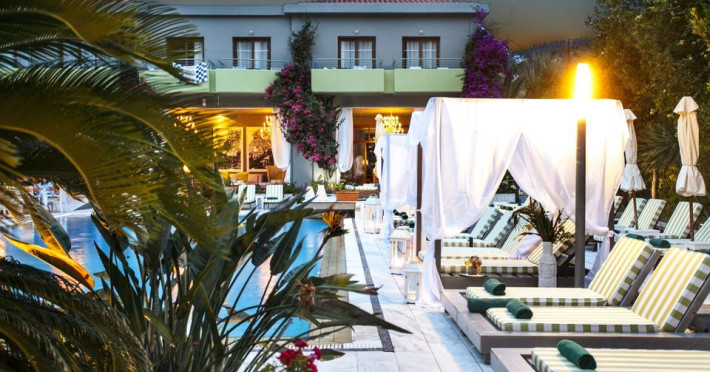 Awarded as one of the best design hotels in Skiathos Island La Piscine Art Hotel is a 5 star hotel located in the center of Skiathos only 100m away from the most popular street, Papadiamantis Street, 2 km away from the airport and 500m away from the port. The impression from the entrance of the hotel and the pool is magical. The artistic element dominates everywhere in our hotel in Skiathos which occasionally hosts art exhibitions. We hope you will have a great time during your accommodation in Skiathos island of Northern Sporades in the Aegean .