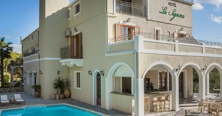 In the south part of the island, in the charming village of Lourdata, is where #34;La Signora#34; boutique hotel is located. Lourdata is a classic example of a typical Kefalonian village. It is built amphitheatrically on a hillside and offers magnificent views of the surrounding rural environment and the Ionian Sea. It is a highly popular holiday area with a variety of tourist accommodations built in a absolute harmony with the natural environment. #34;La Signora#34; (ex Lara Hotel) is a fully newly-renovated 4* boutique hotel and an ideal choice for all guests who enjoy being in contact with the nature and at the same time enjoy the variety of services a city can offer. The accommodation distances just a 25 drive apprx from Argostoli - the capital of the island and a couple of minutes walk from the sandy beach of Lourdata ( Lourdas beach). A variety of taverns, restaurants, bars and mini markets is also within a walking distance from the accommodation. _REFERENCE POINTS_ * Airport: Kefalonia International #34;Anna Pollatou#34; [EFL] : 13.5 km * Beach: Lourdas : 350 m * City center: Argostoli city : 16.2 km * Port: Poros port : 25.2 km | Sami port: 28 km _POINTS OF INTEREST_ St, Andreas Monastery amp; Byzantine museum: 8.4 km || Church of Virgin Mary in Markopoulo: 11.2 km || #34;St. Georges#34; Venetian castle (Kastro): 12 km || Monastery of #34;St.Gerasimos#34;: 9.6 km || #34;Aenos#34; (Ainos) Mt. : 31.4 km || #34;Myrtos#34; beach: 41.2 km || #34;Melissani#34; lake: 29.4 km || #34;Fiscardo#34; village: 61.6 kmDatorita dinamicitatii domeniului disponibilitatea ofertelor se modifica de la un moment la altul. De aceea ofertele sunt valabile in limita locurilor disponibile. Agentia nu este responsabila pentru eventualele neconcordante care pot aparea intre informatiile privind tarifele si alte detalii din site si informatiile primite in agentie. In aceste cazuri vor avea prioritate, intotdeauna, informatiile primite in agentie.