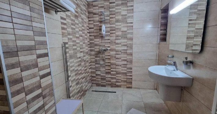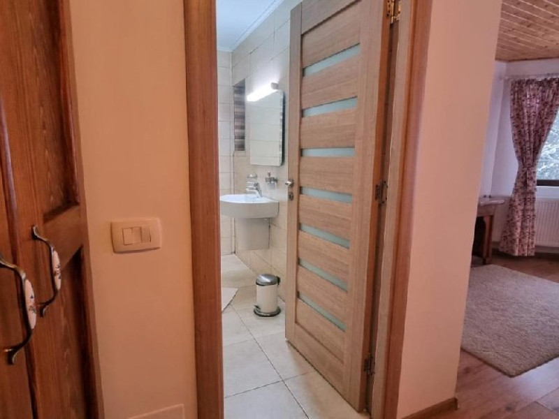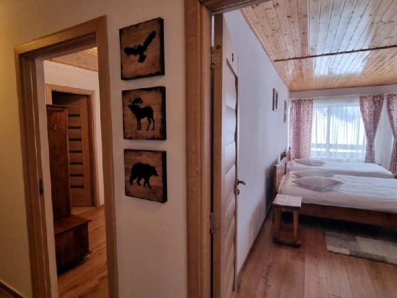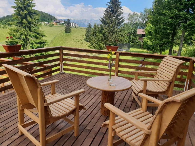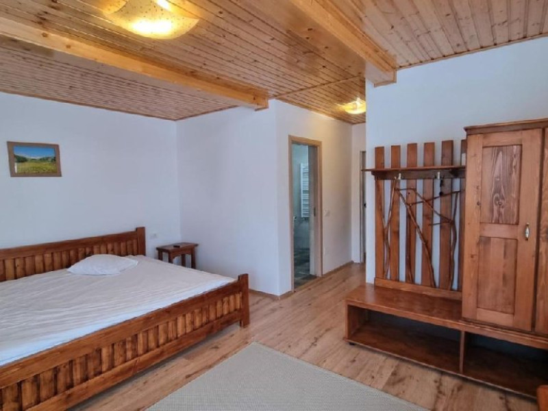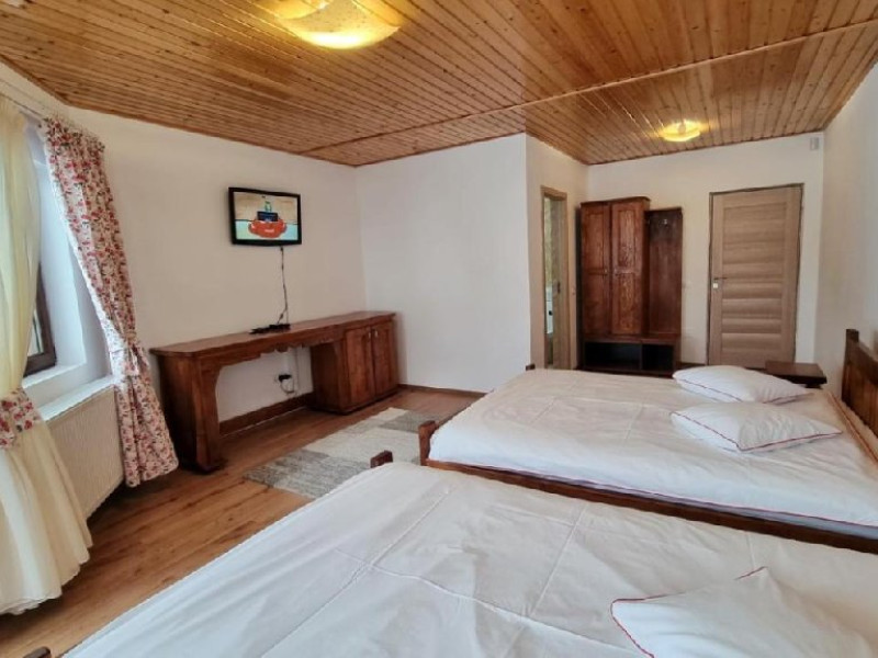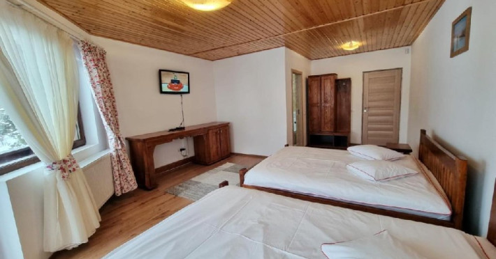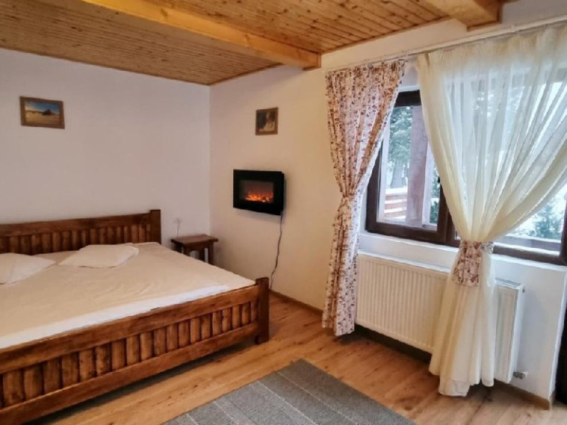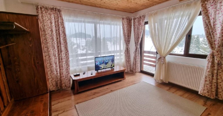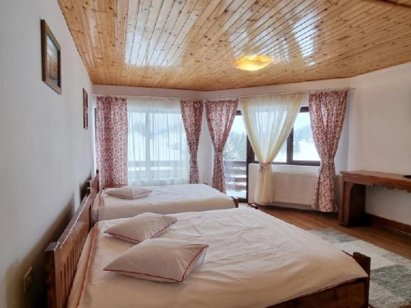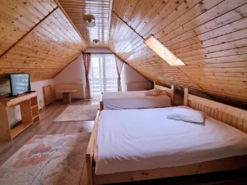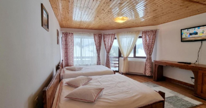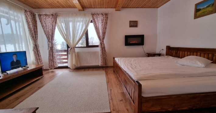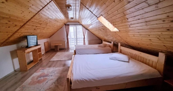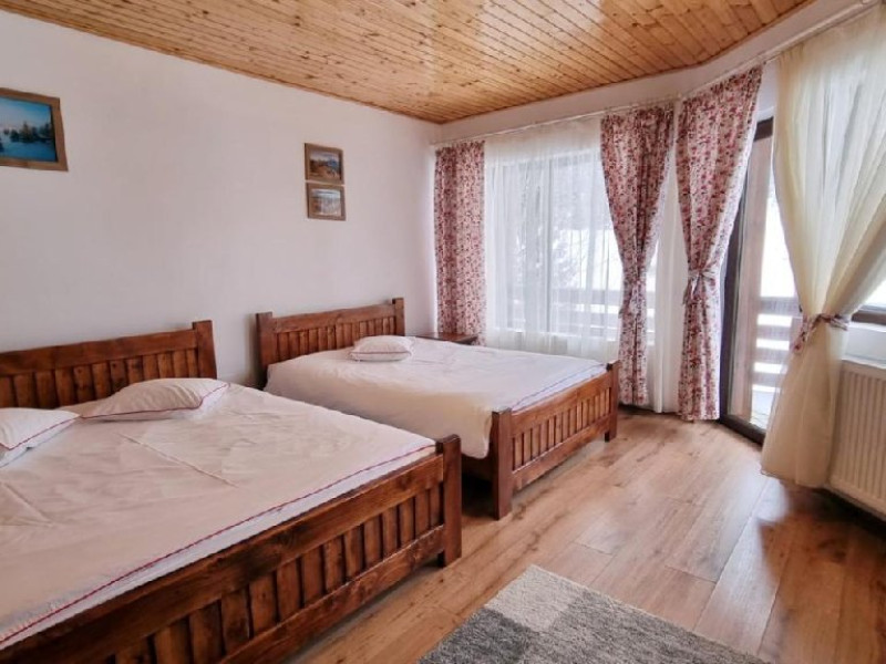 Camera cvadrupla ofera doua paturi duble si un balcon cu vedere catre munte.