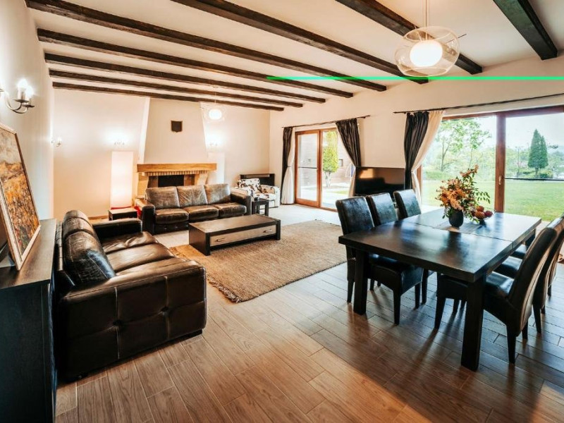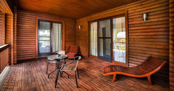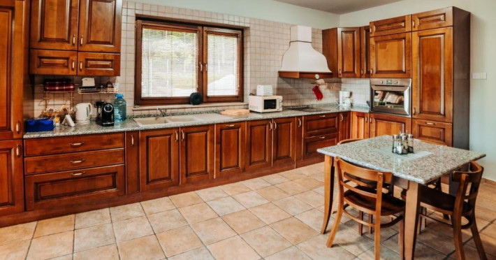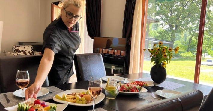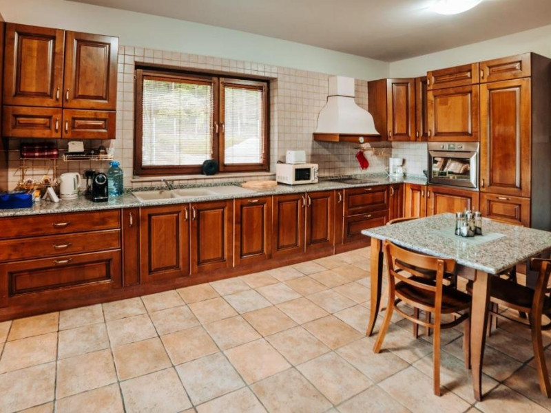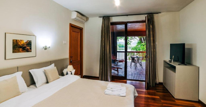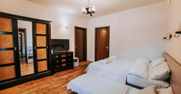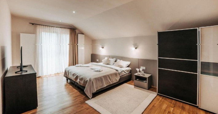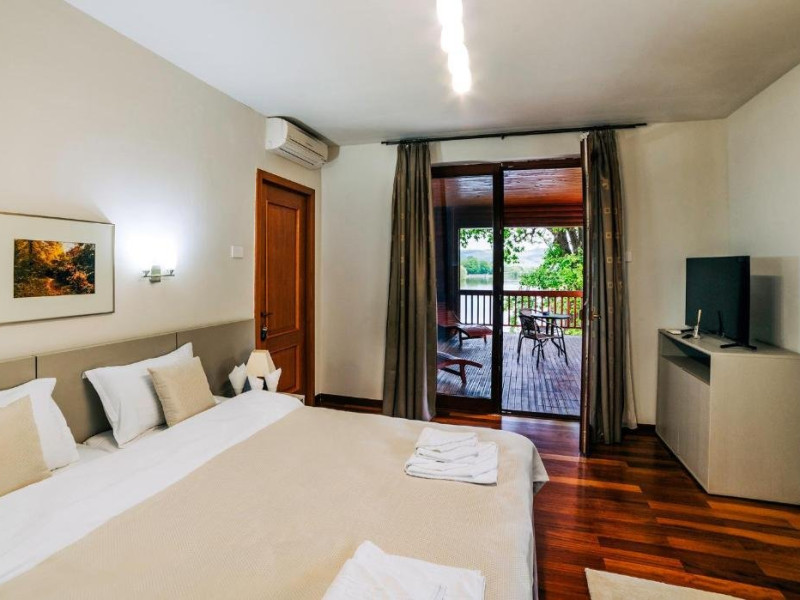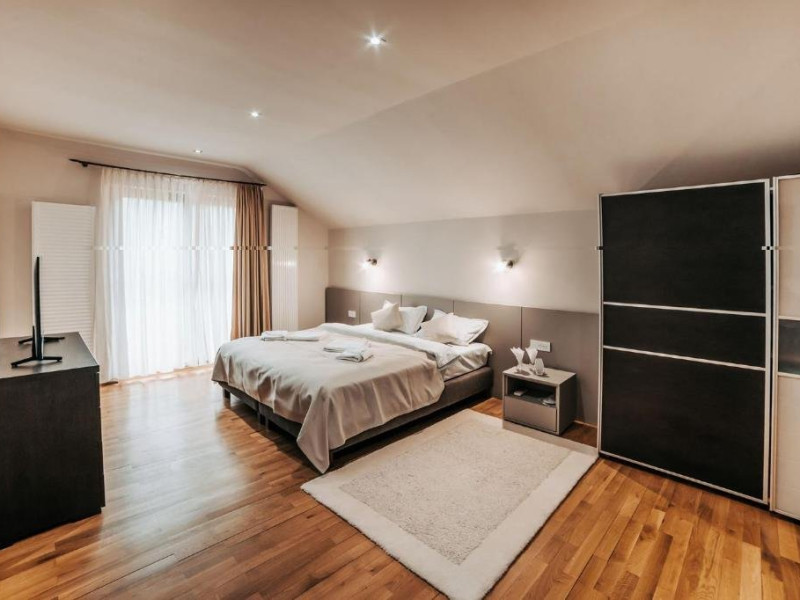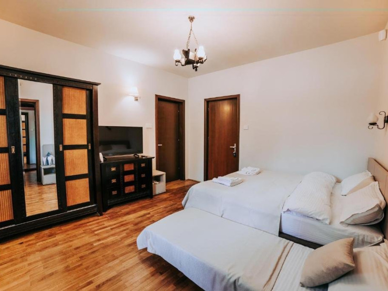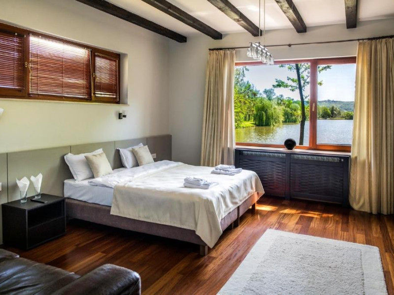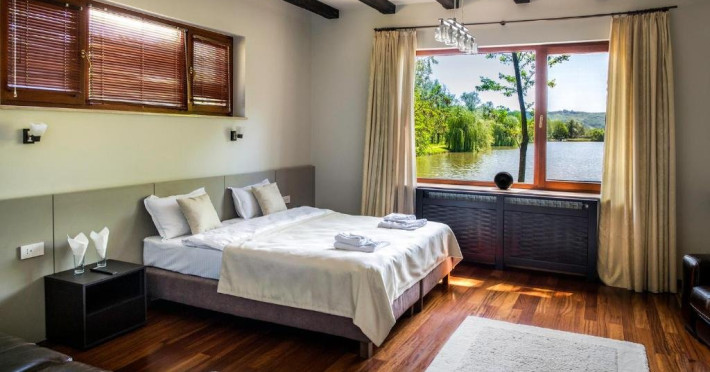Casa Peluza - cu o suprafata de aproximativ 100 mp, are 3 dormitoare fiecare cu pat matrimonial si baie proprie cu dus, sufragerie cu canapea extensibila, balcon cu vedere lac, dar si la gradina, bucatarie utilata, AC, TV, internet, Poate acomoda 6 adulti, suplimentar 2 copii, inchiriere integrala vila.