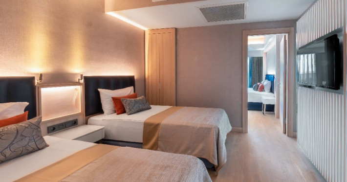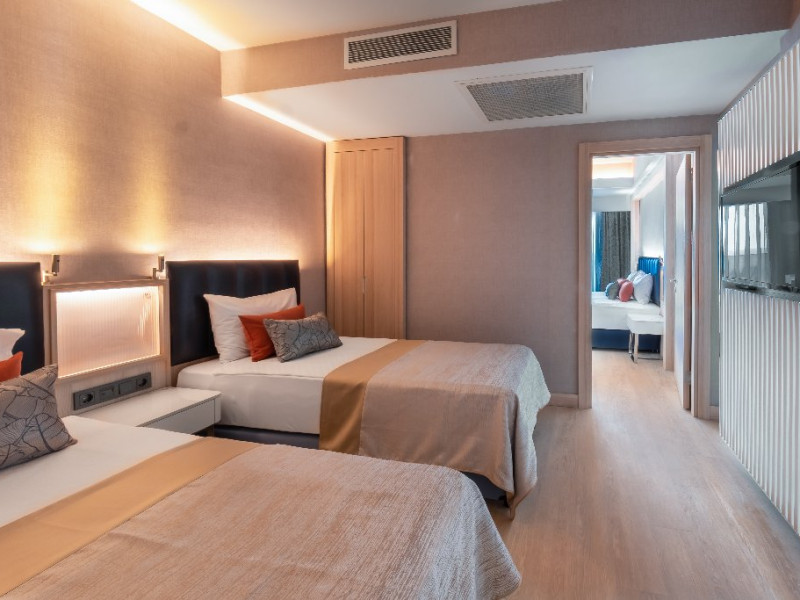 Facilitati hotel: Hotelul ofera oaspetilor sai multiple facilitati: restaurant principal, 4 restaurante a la carte, 8 baruri, patiserie, 10 piscine exterioare, aquapark cu 27 tobogane (12 pentru adulti, 13 pentru copii, 2 pentru copii langa miniclub), 1 piscina interioara pentru adulti, internet in zonele comune, centru SPA, sauna, hammam, centru fitness, aerobic, discoteca, programe de animatie, terenuri de tenis, tenis de masa, darts, volei si fotbal pe plaja, teren de joaca, miniclub, animatie, minidisco, minicinema, scaune pentru copii la restaurantul principal, snack-uri, fresh-uri (contra cost).