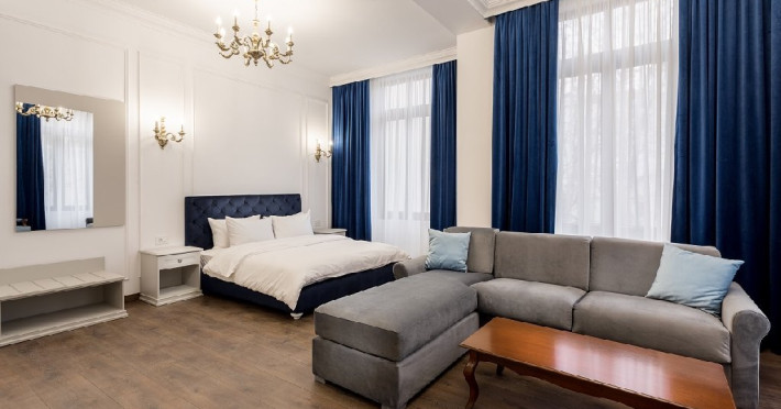 Junior Studio 11 are o suprafata de 40 mp si este compus dintr-un dormitor confortabil de 21 mp, dotat cu pat King-size, birou si masa cu scaun, precum si televizor Smart LED cu diagonala de 138 cm. Camera poate gazdui 2 adulti.