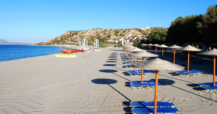 Lakitira Resort are în apropiere o plajă cu nisip. Pe plajă există șezlonguri și umbrele de plajă.