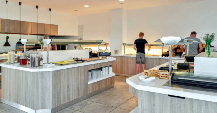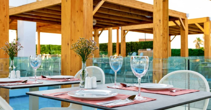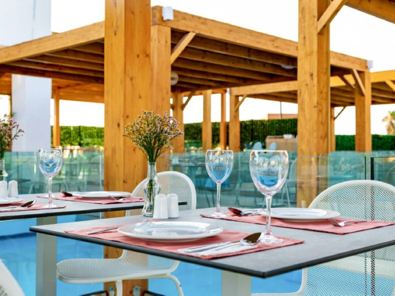 Mesele sunt servite in regim bufet in restaurantul hotelului. Meniul include preparate din bucataria greceasca si internationala, pregatite din produse locale. Gustari si bauturi sunt disponibile pe tot parcursul zilei.