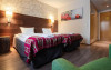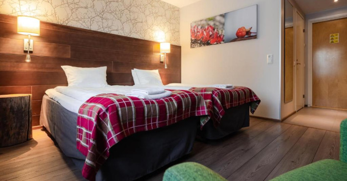Camerele confortabile imbină stilul scandinav cu elementele tradiționale lapone, creand o atmosferă caldă și primitoare. Facilitățile hotelului includ saună finlandeză, restaurant cu specific local și lounge bar unde vă puteți relaxa după o zi pe partie.