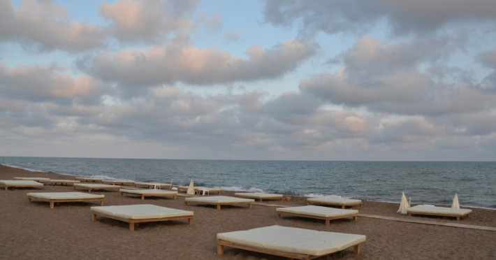Lara Hadrianus Hotel are în apropiere o plajă cu nisip. Pe plajă există șezlonguri și umbrele de plajă.