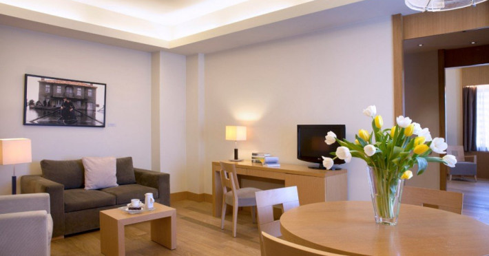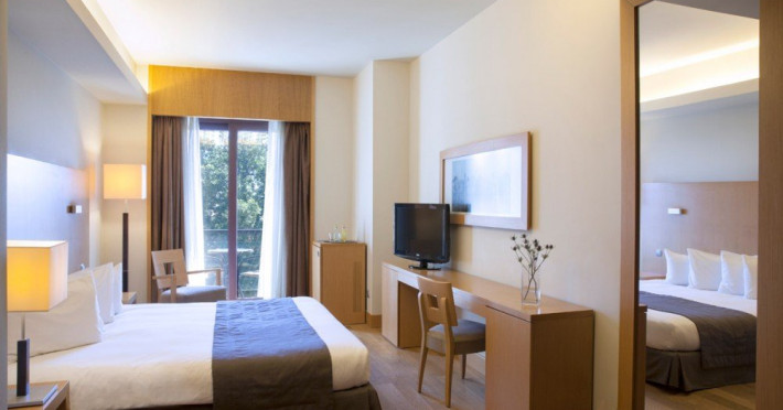 Suita Family: suprafata 45 mp, pat matrimonial sau paturi twin, living cu canapea extensibila, baie cu dus sau cada, vedere la piscina, max. 2 adulti + 2 copii