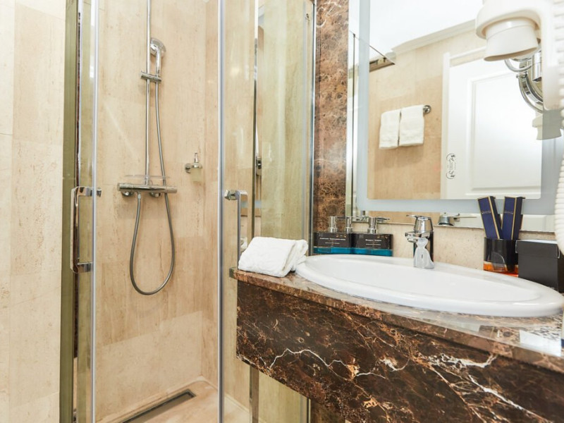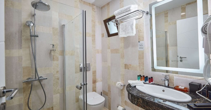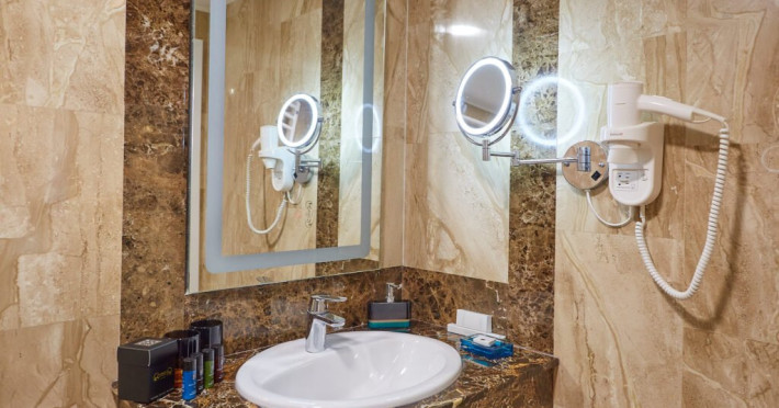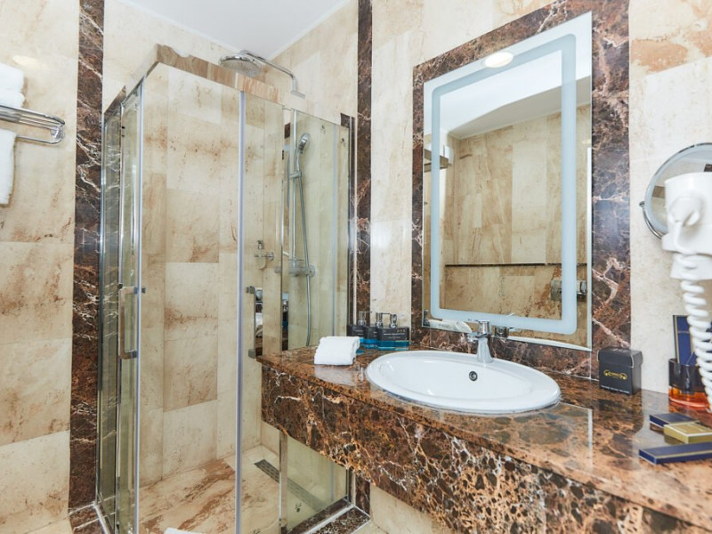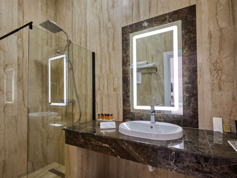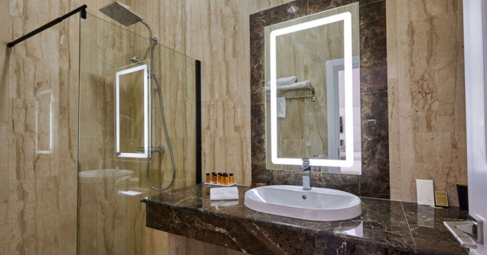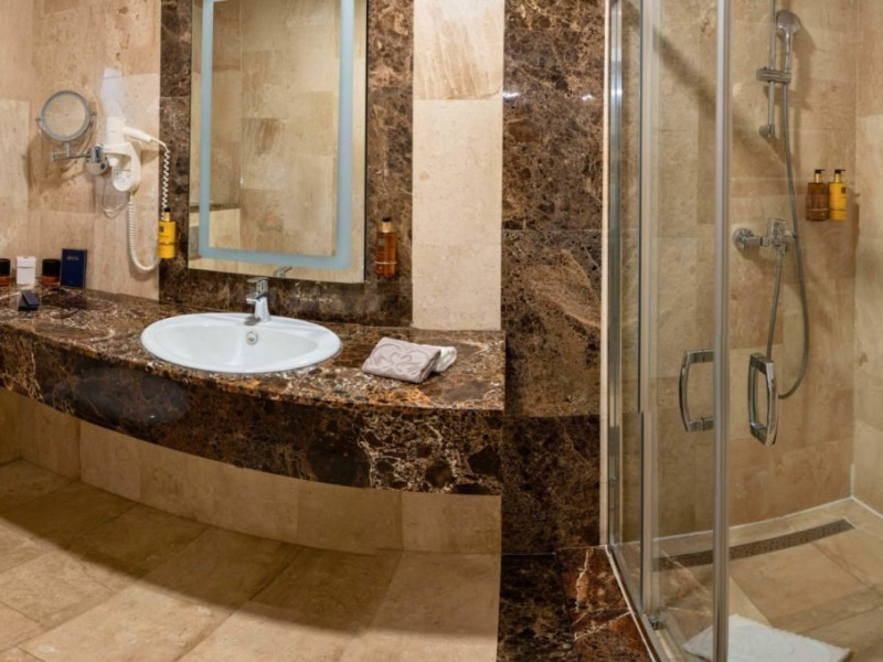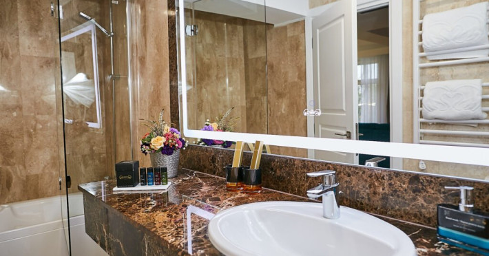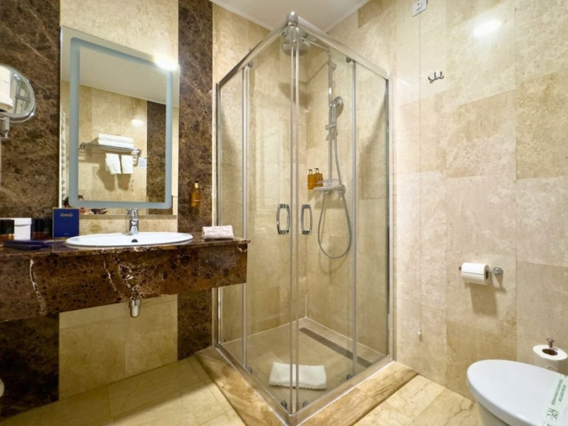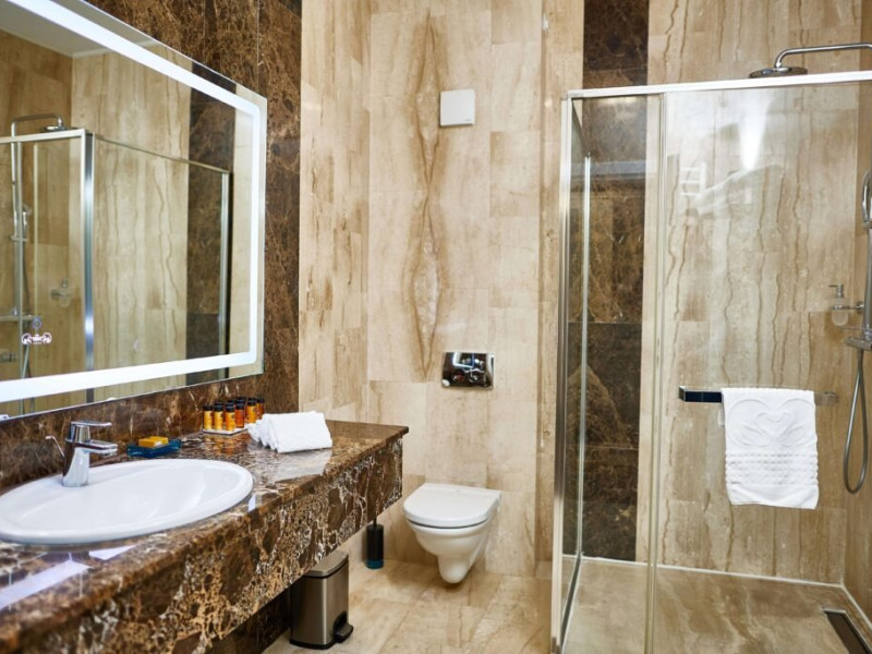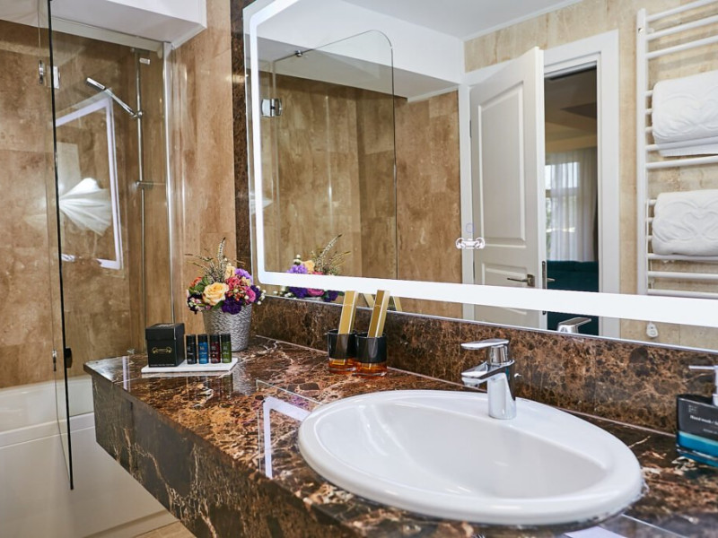 Baia privata a Suitei Junior este dotata cu accesorii de inalta calitate si elemente elegante, oferind oaspetilor o experienta cu adevarat de 5 stele. Layout-ul spatios include o zona de toaleta cu o oglinda mare si iluminat sofisticat, amplificand confortul si comoditatea. Zona de zi, echipata cu o canapea vibranta, adauga un strop de culoare si o atmosfera vesela suitei. Suita ofera, de asemenea si un colt confortabil de relaxare, fiind ideala pentru sederi prelungite si creand cadrul perfect pentru destindere dupa o zi de explorare. Cu designul sau atent gandit, Suita Junior asigura o sedere memorabila la Lebada Luxury Resort & SPA.