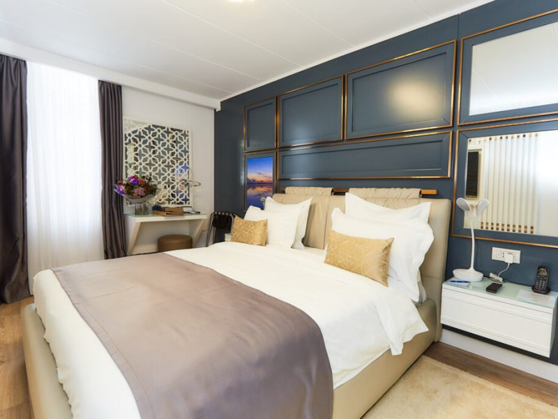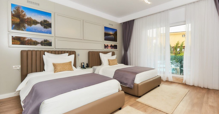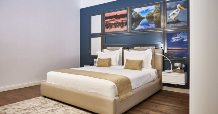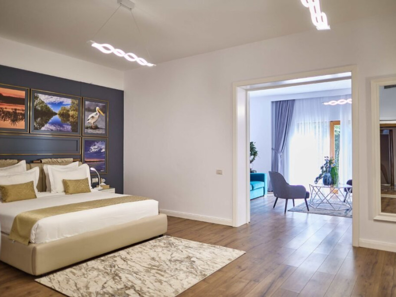 Suita cu doua dormitoare la Lebada Luxury Resort & SPA ofera un refugiu de rafinament si confort, conceput pentru a asigura o sedere exceptionala. Acest tip de unitate de cazare include doua dormitoare spatioase, fiecare mobilat cu un pat king-size, cu asternuturi confortabile si decor elegant. Elementele de design contemporan, precum peretii cu lambriuri si corpurile de iluminat moderne, creeaza o atmosfera calma si sofisticata. De asemenea, suita dispune de o baie frumos proiectata cu finisaje din marmura, un dus spatios si facilitati de inalta calitate, adaugand un strop de opulenta rutinei zilnice.