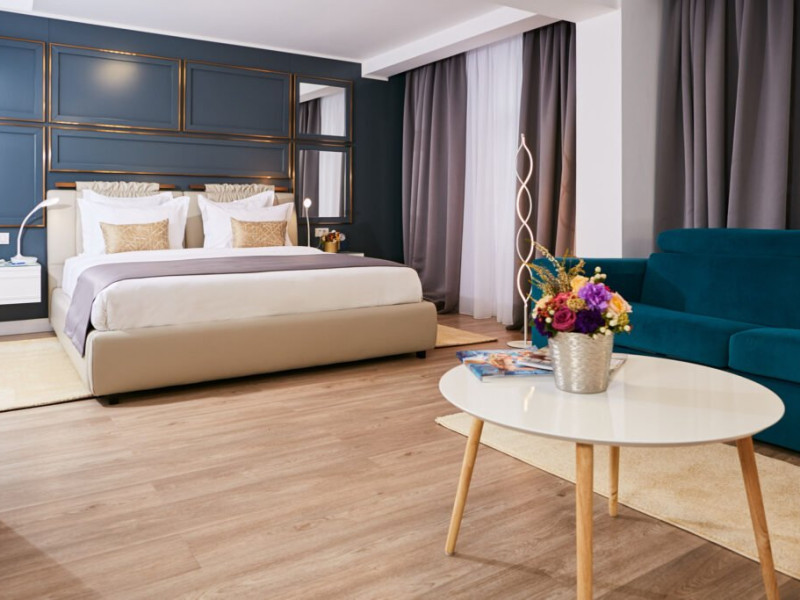 Suita Junior reprezinta alegerea ideala pentru familiile care cauta confort si eleganta. Aceasta include un pat king-size si o canapea extensibila confortabila, oferind spatiu generos pentru doi adulti si doi copii. Designul interior combina estetica moderna cu elemente primitoare, creand o atmosfera familiala. Suita este decorata cu iluminare ambientala si decor contemporan, generand o ambianta calma, perfecta pentru relaxare.
