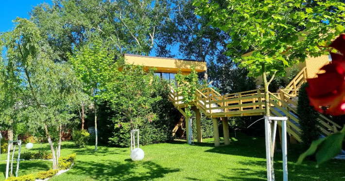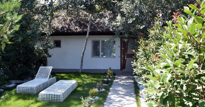 Bungalow are in dotare pat matrimonial si canapea extensibila in living, terasa privata cu vedere la Dunare. Suprafata: 23.8 mp.