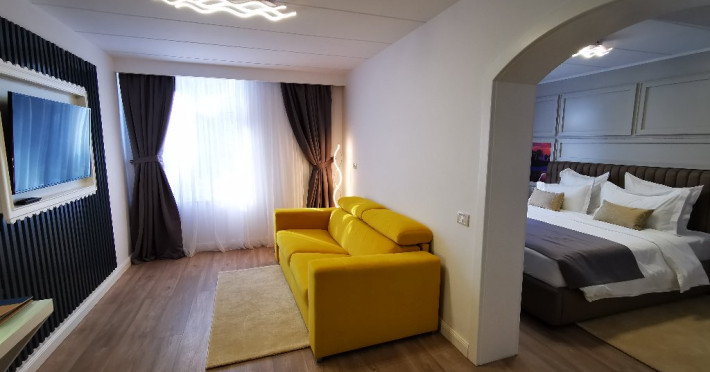 Junior Suite are in dotare pat matrimonial si canapea extensibila in living, cu vedere la gradina sau la Dunare, fara balcon, fara usa intre camere. Suprafata 31.5 mp.