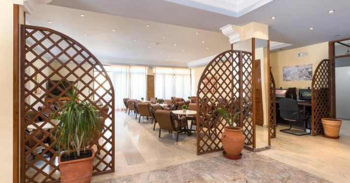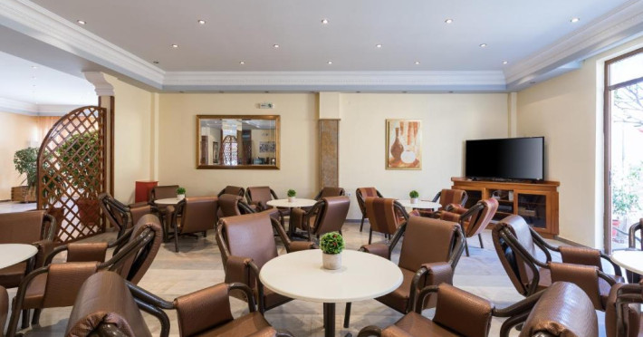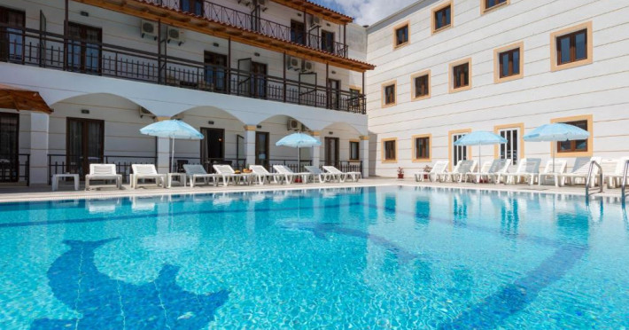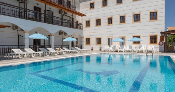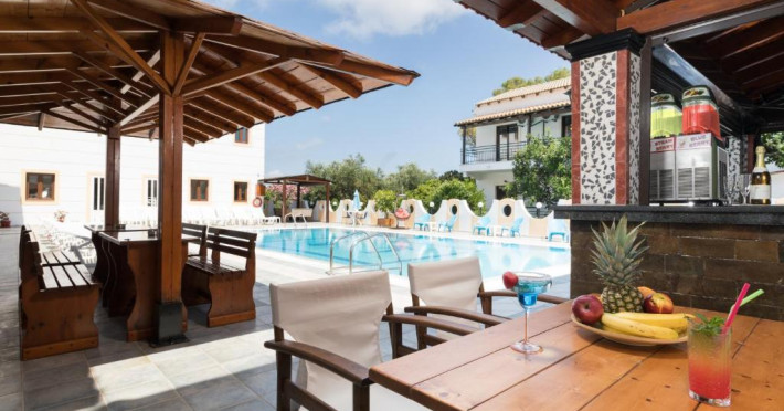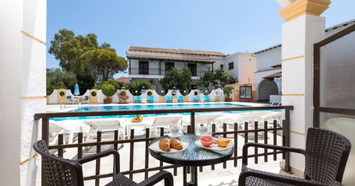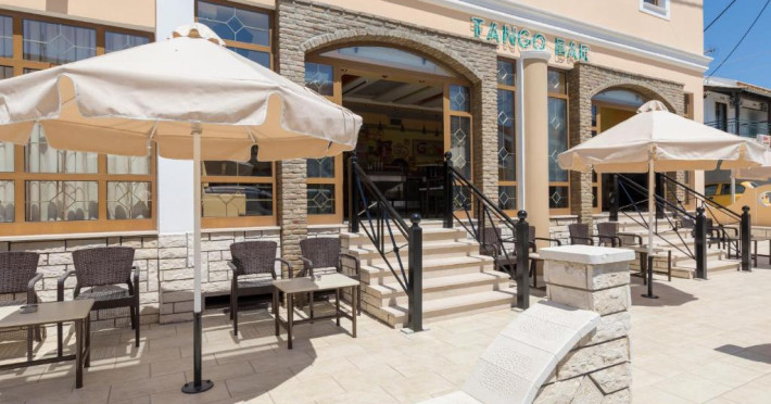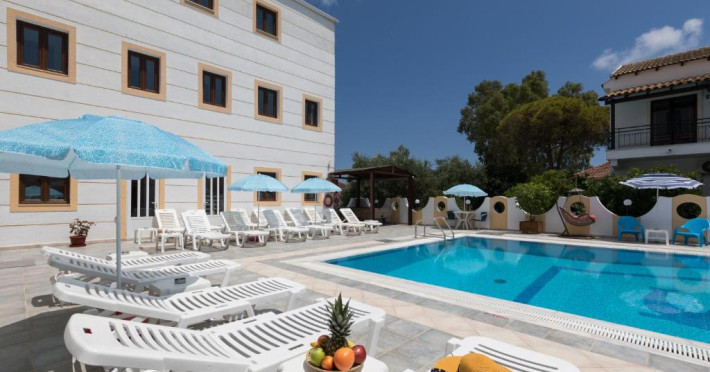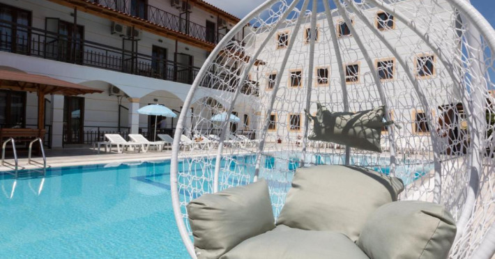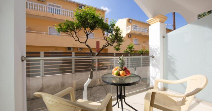 Oaspeții se pot relaxa pe terasa de la Lefkimi Hotel.