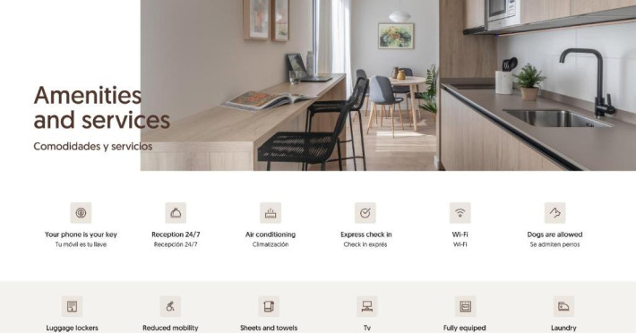 Fiecare unitate are baie privată, cadă sau duș, aer condiționat, televizor și cuptor cu microunde. Unele unități au terasă și/sau balcon.