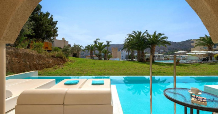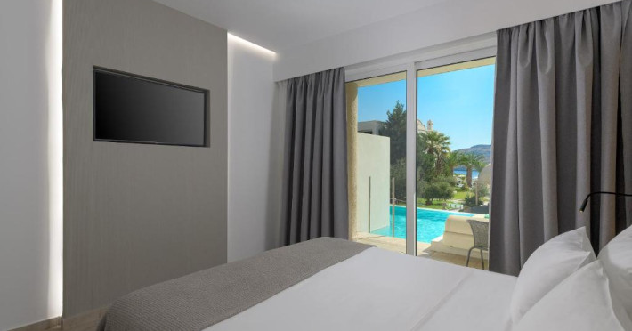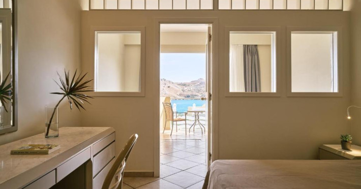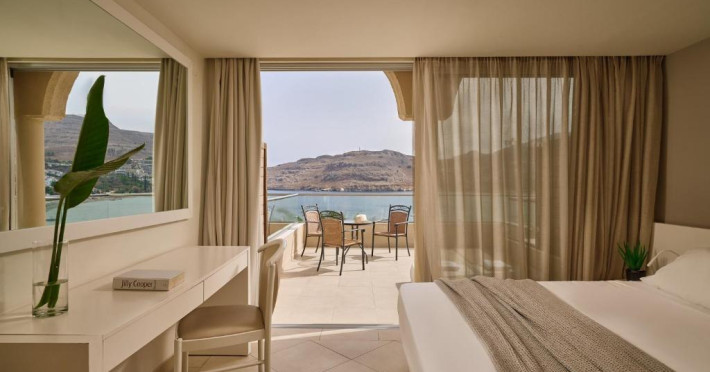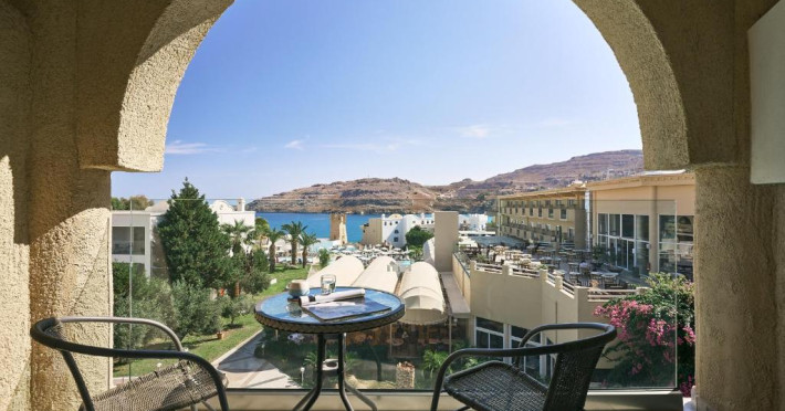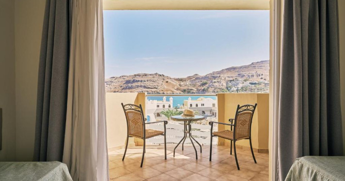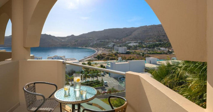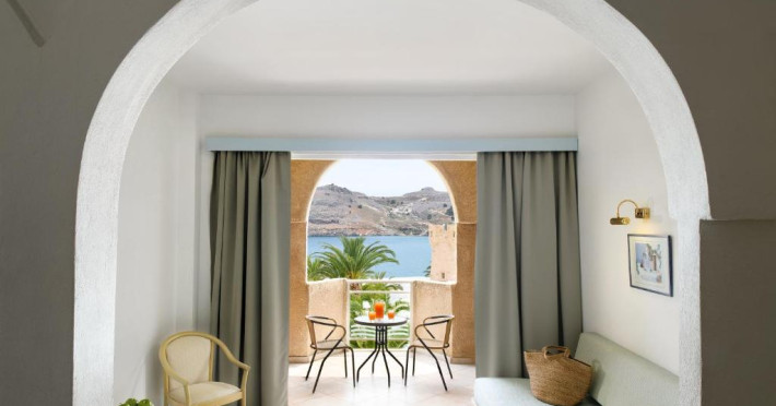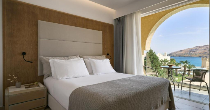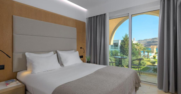 Camerele mari si luminoase ale complexului Lindos Royal sunt amenajate cu gust si au vedere uimitoare la Marea Egee albastră, la golfurile din jur si la grădini si piscine.