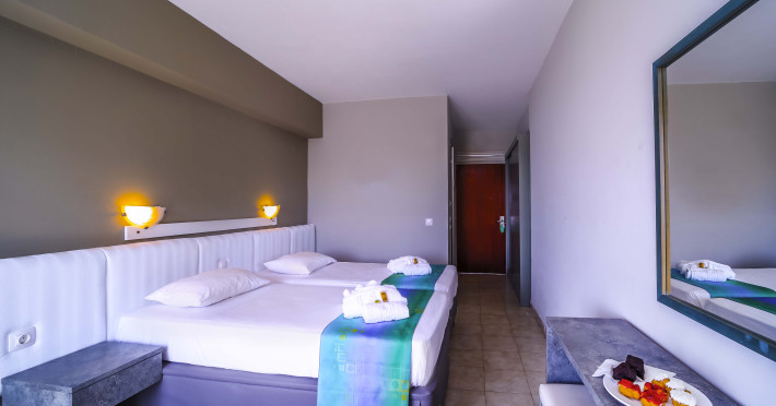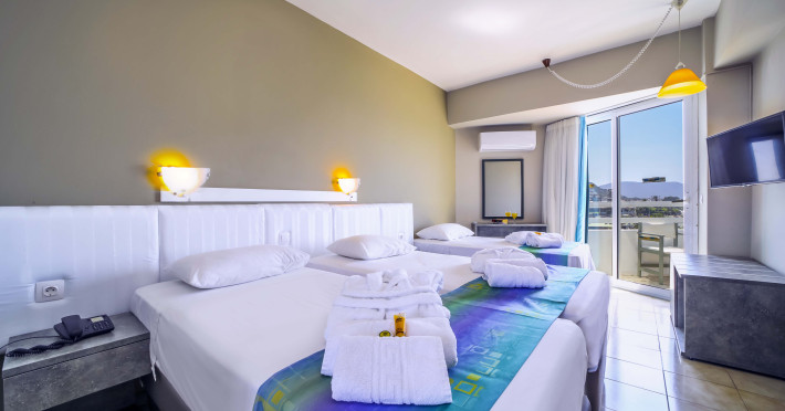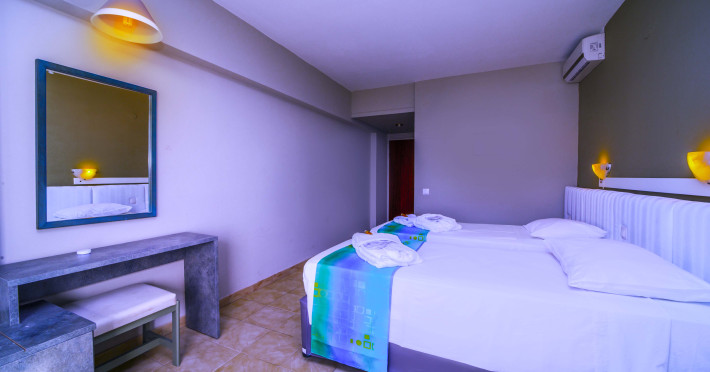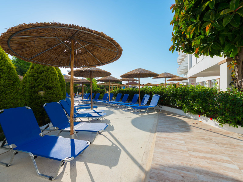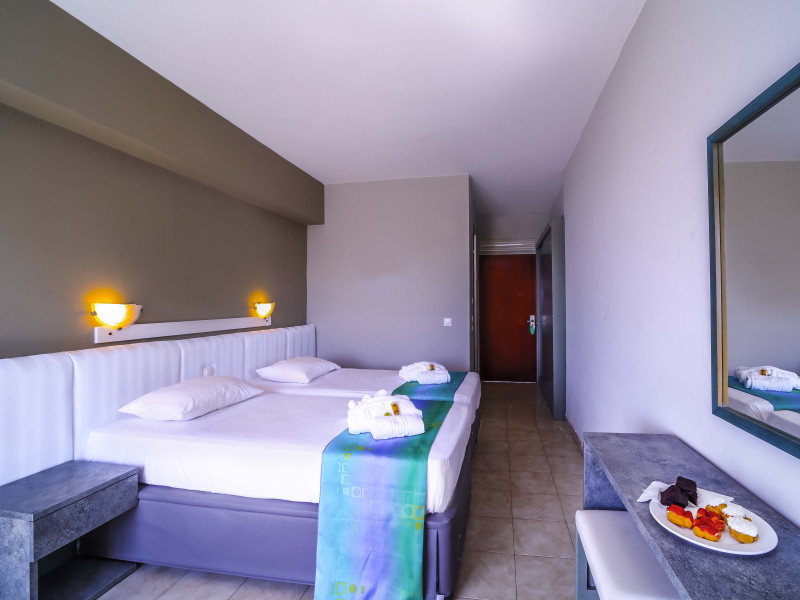The rooms at Lito Hotel have a balcony enjoying views to the pool, the garden or the Aegean Sea. Each is fitted with a satellite TV, a mini fridge and a marble bathroom with bathtub or shower.