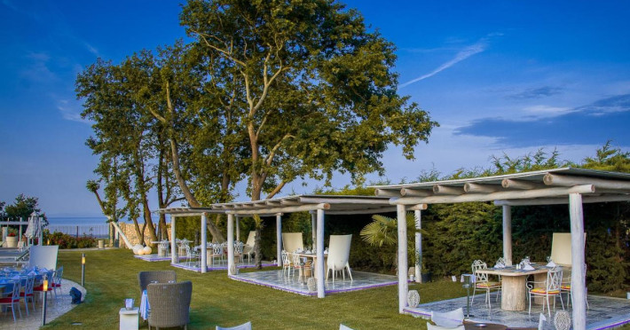 Elia, restaurantul principal, şi restaurantul Gourmet, care oferă vedere superbă la mare, servesc preparate greceşti şi mediteraneene. Café-barul serveşte băuturi și cocteiluri reconfortante. Complexul oferă parcare privată gratuită.
