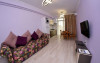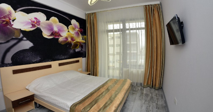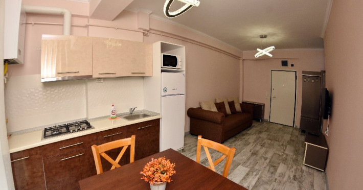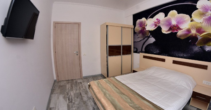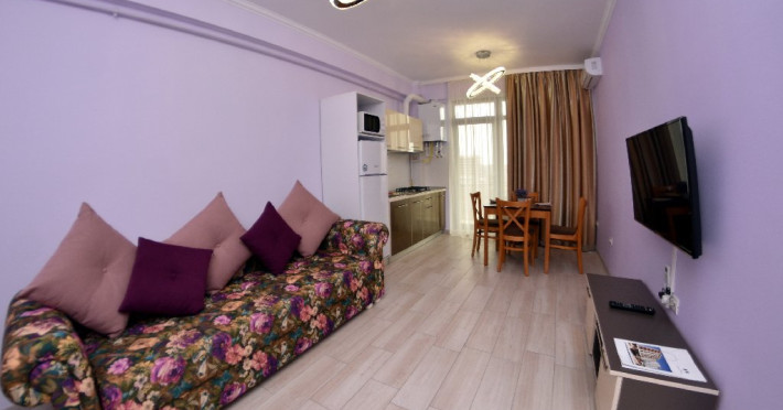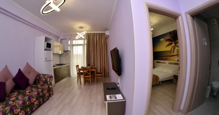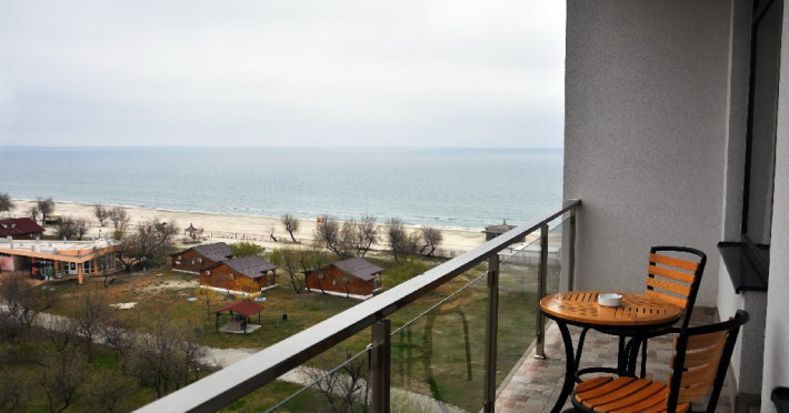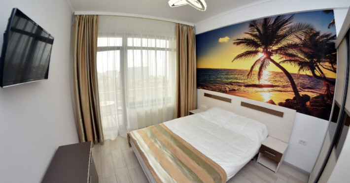 Apartamentele situate la etajele superioare (Studio si Sea View) sunt identice ca suprafata si dotari: dormitor cu pat matrimonial, living cu canapea extensibila pentru 2 adulti, balcon, bucatarie echipata, cuptor cu microunde, frigider, ocupare maxima 4 adulti.