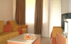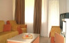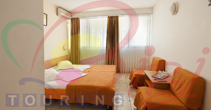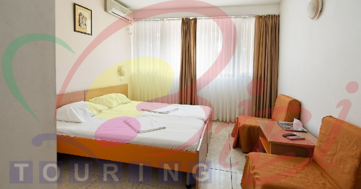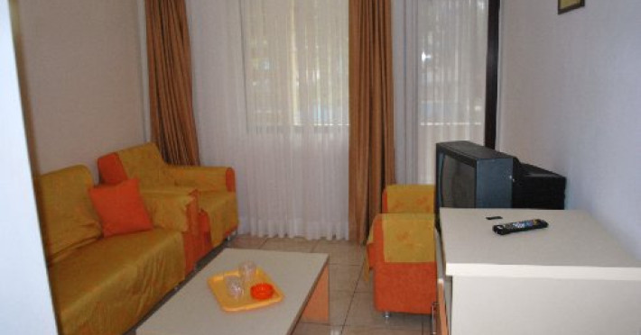 Camere: Camerele duble sunt dotate cu: pat matrimonial sau 2 paturi, mobilier nou, TV, minibar, baie cu cadita, balcon (camere etaj), aer conditionat, pardoseala din gresie si masuta. Apartamentele au living cu canapea extensibila si dormitor cu pat matrimonial.