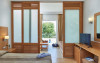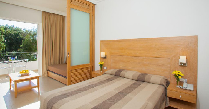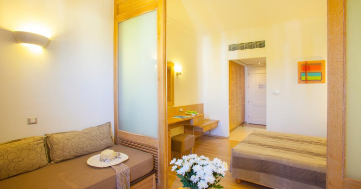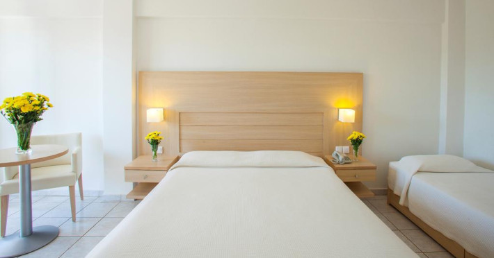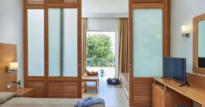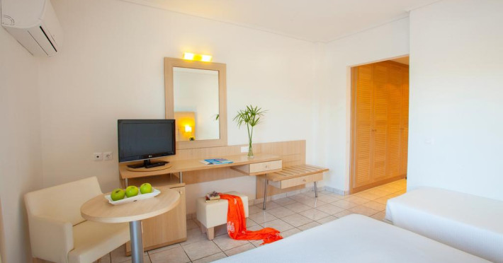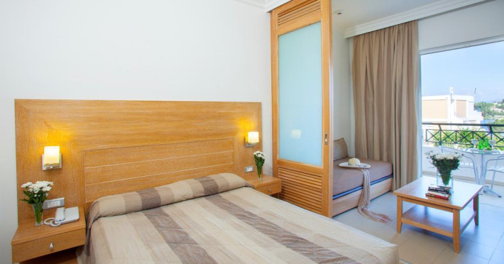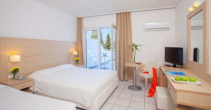 În camere există baie cu cadă sau duș prevăzută cu foehn. Unele camere au balcon cu vedere la mare, unde oaspeții pot admira apusul sau răsăritul soarelui. Camerele de la Louis Corcyra Beach sunt dotate cu aer condiționat, Tv cu canale prin satelit și seif. Curățenia in cameră se face zilnic. Fiecare unitate de cazare are frigider. Proprietatea oferă camere pentru familie cu o suprafață mai mare și un număr mai mare de paturi față de cele standard. Se pot rezerva de asemenea camere pentru nefumători.