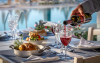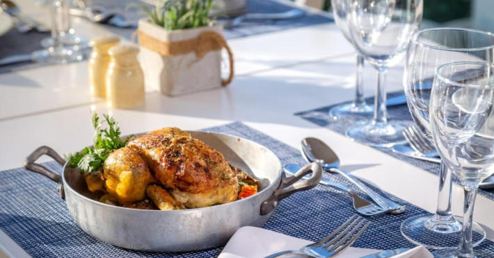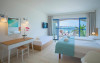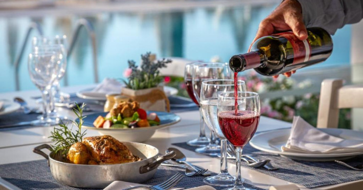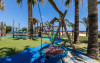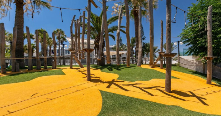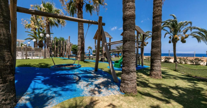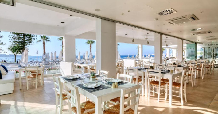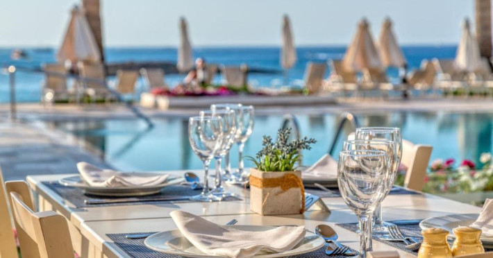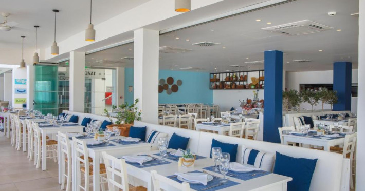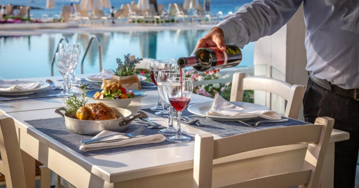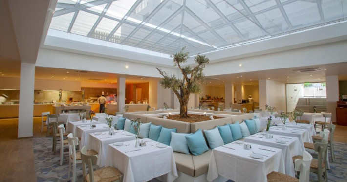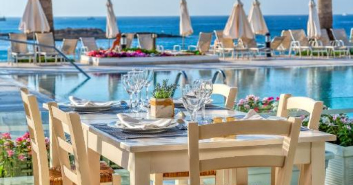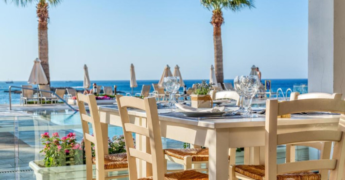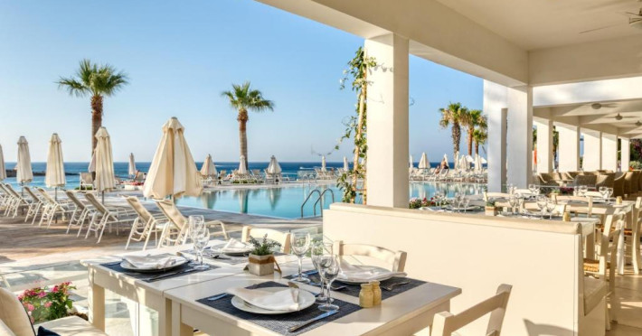 The hotel features indoor and outdoor restaurants including a Greek Taverna, an outdoor bar, 2 outdoor pools, kids pool, fitness centre, spa & wellness centre, an original kids playground, volleyball court, tennis, table tennis and a panoramic amphitheatre offering daily evening entertainment shows for both adults and children