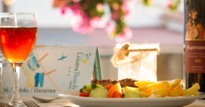 La Loutra Beach oaspeții au la dispoziție un restaurant care servește mâncare în stil bufet. Oaspeţii pot avea diverse băuturi răcoritoare sau alcoolice la bar.