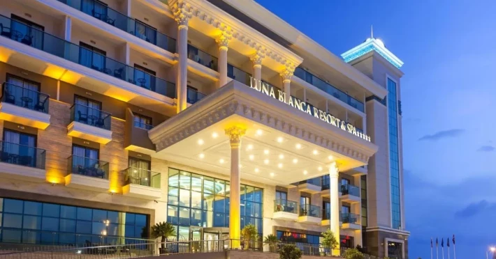 Localizare: Hotelul Luna Blanca Resort & Spa este situat la 65 km de aeroportul Antalya, la 70 km de centrul orasului Antalya, la 6 km de centrul Side, la 300 m de plaja proprie. Acest hotel a fost construit in anul 2014 si se intinde pe o suprafata totala este de 12 000 m2. Facilitati hotel:restaurant principal, 3 restaurante a la carte (japonez, pescaresc si italian), 3 baruri, 4 piscine exterioare, piscina interioara, 3 tobogane (la anumite ore), medic (la solicitare, contra cost), centru SPA, coafor, lant de magazine, spalatorie, sala de conferinte (120-170 pers.), internet WiFi.Alte facilitati:baie turceasca, sauna, baie cu aburi aerobic, aqua aerobic, volei pe plaja, darts, bocce , tenis de masa, animatie, discoteca. Facilitati camere: Camerele sunt frumos decorate si utilate cu facilitati precum: baie cu dus, foehn, aer conditionat centralizat, televizor telefon, minibar ,seif (gratuit) balcon. Plaja este privata cu nisip. Exista bar pe plaja; umbrele, sezlonguri, saltele, prosoape - gratuit.Localizare