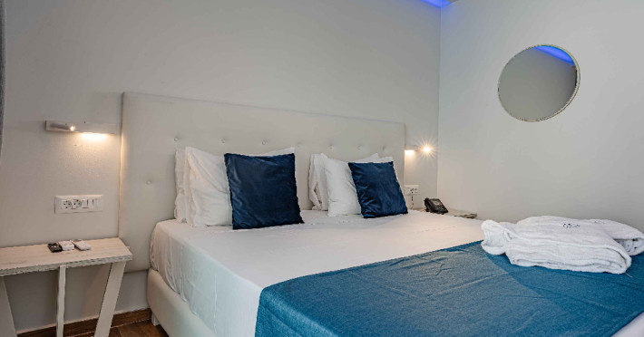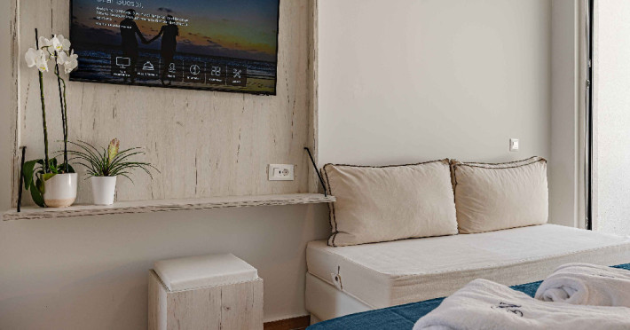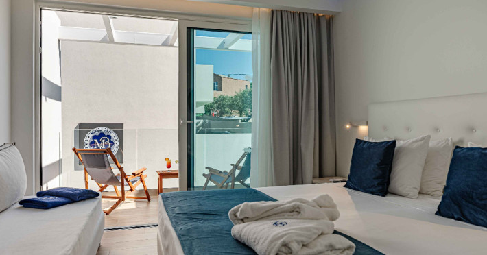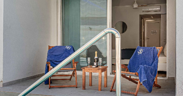 Suita Junior Sun Deck aprox. 24 m2; plan deschis (max 2+1 pax: 1 pat dublu sau 2 paturi twin & 1 single sau canapea extensibila.