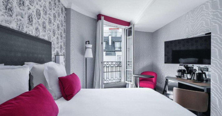 Camerele de la Maison Astor Paris au TV cu ecran plat cu canale prin cablu, aparat de ceai/cafea și ferestre izolate fonic.
