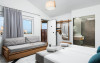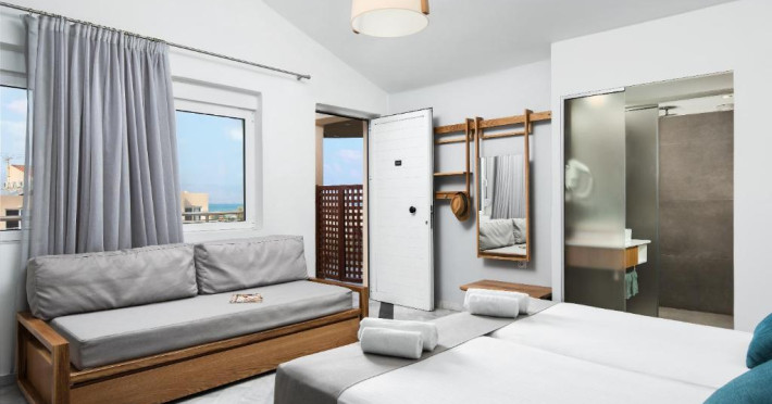 Camerele confortabile de la Maleme Mare Beach au pardoseală de gresie/ marmură, aer condiționat, Tv cu canale prin satelit și seif. Fiecare cameră dispune de mașină pentru preparare cafea sau ceai și fierbător Oaspeții au acces gratuit la serviciul Wi-fi în camere. Camerele au balcon cu vedere la mare, la piscină sau la grădină. În camere există baie cu cadă sau duș ce are în dotare foehn și articole de toaletă gratuite. Curățenia in cameră se face zilnic. Există unități de cazare care au chicinetă utilată cu frigider și ustensile de bucătărie. Proprietatea oferă camere pentru familie cu o suprafață mai mare și un număr mai mare de paturi față de cele standard.