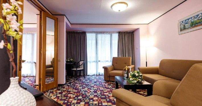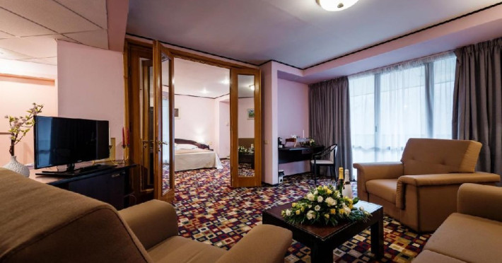 Apartament senior suite (63 mp): un apartament compus din 2 camere distincte, sufragerie si dormitor, care in cazul in care doriti pot comunica direct deschizand peretele-usa dintre cele 2 camere. In sufragerie exista o canapea extensibila ideala pentru familiile cu copii sau un al treilea adult. Dispune de baie principala si baie de serviciu, un balcon imens.