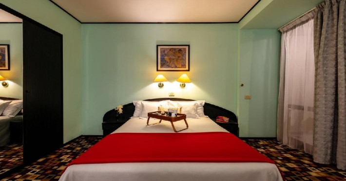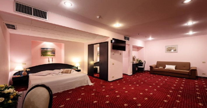 Camere duble matrimoniale de lux (55 mp): dispun de King Size Bed (2 x 2 m), canapea extensibila, fotolii, mini-birou.