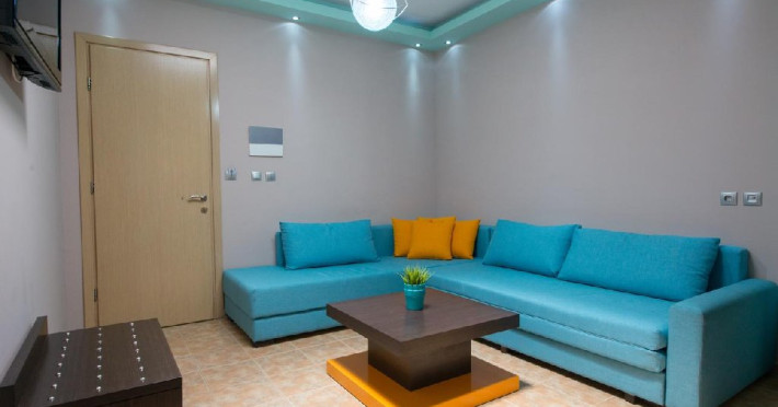 Apartament: 60 m2: dormitor cu pat matrimonial si living cu canapea extensibila.