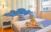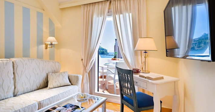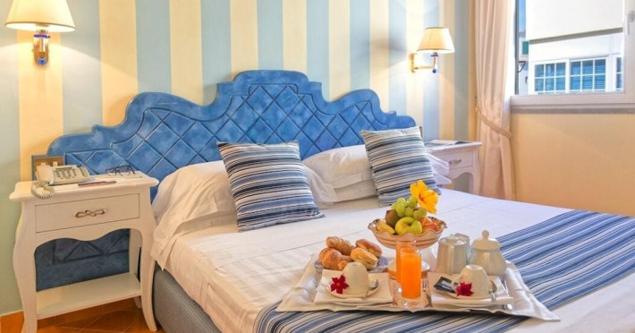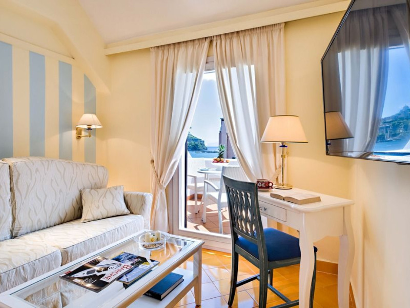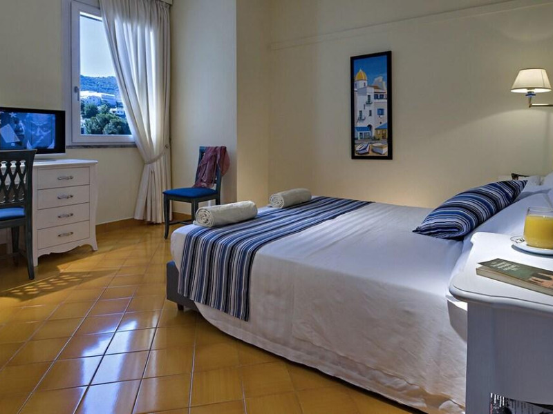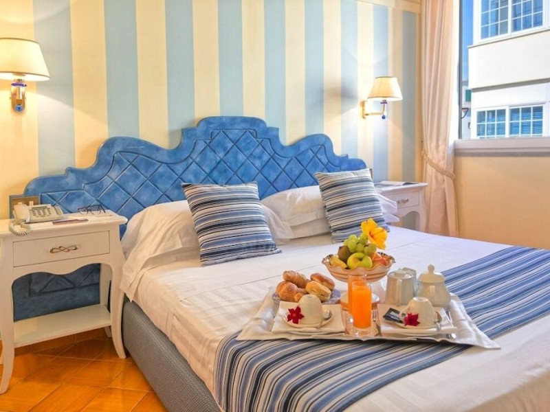 Mare Blu Terme hotel is located in the most suggestive corner of the historic center of Ischia, with a splendid view of the Aragonese Castle and the islands of Vivara and Procida. 200 meters from the promenade of the shops and 1 km from the port. The welcome is that of a lush garden, made so beautiful by typical island scents and colors. Inside, the hotel rooms are characterized by British-style furnishings: sofas, fireplace, sitting room, books, everything contributes to giving the hotel a soul all its own. You will also find quiet corners of refreshment where you can relax and sunbathe, read a book, meditate.Different types of rooms, each with its own peculiarity, where the colors of the sea mix with warm pastel shades and the furnishings, always well-kept, complete the rooms making them bright and soothing. Even the bathrooms leave nothing to chance: Vietri ceramics and colorful mosaics. The Standard rooms, bright and quiet, overlook the quiet of the garden and the village of SantAntonio. The Sea View rooms are very comfortable and suggestive, thanks to the view of the Aragonese Castle. The Superior rooms, welcoming and spacious, have a furnished balcony overlooking the greenery of the garden. The Deluxe rooms offer a splendid view of the Aragonese Castle thanks to the sea view terrace, spacious and furnished with comfortable sun loungers. The Junior Suites with garden view are rooms for those looking for comfort: space, light and a lovely sitting room where you can spend a few moments in tranquility. The Suite ensures the most exclusive stay with two terraces with breathtaking views: one of the historic church of SantAntonio and one directly on the sea and the Aragonese Castle.Colazione a buffet e pranzo la carte nel ristorante o al gazebo in piscina con cucina tipica regionale e internazionale. Remarks: Rates do not include any local city tax and resort fee that must be paid by the final customer on-site directly to the hotel. Bedding preferences are not guaranteed and are subject to supplier availability. Front Desk H24 , Check-in from 15:00 , Check-out to 12:00Datorita dinamicitatii domeniului disponibilitatea ofertelor se modifica de la un moment la altul. De aceea ofertele sunt valabile in limita locurilor disponibile. Agentia nu este responsabila pentru eventualele neconcordante care pot aparea intre informatiile privind tarifele si alte detalii din site si informatiile primite in agentie. In aceste cazuri vor avea prioritate, intotdeauna, informatiile primite in agentie.