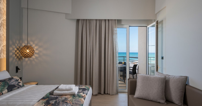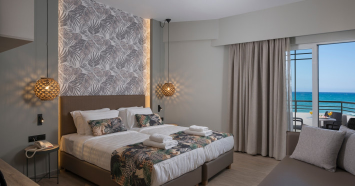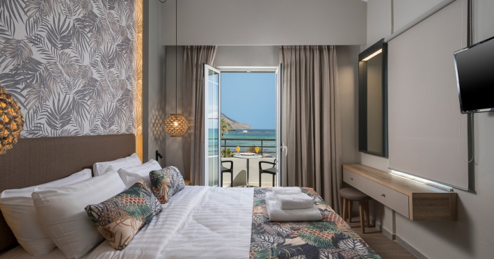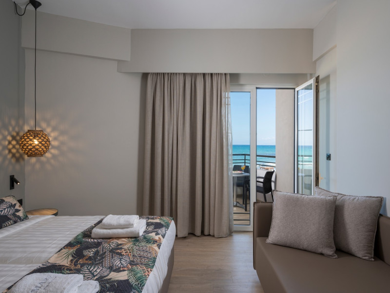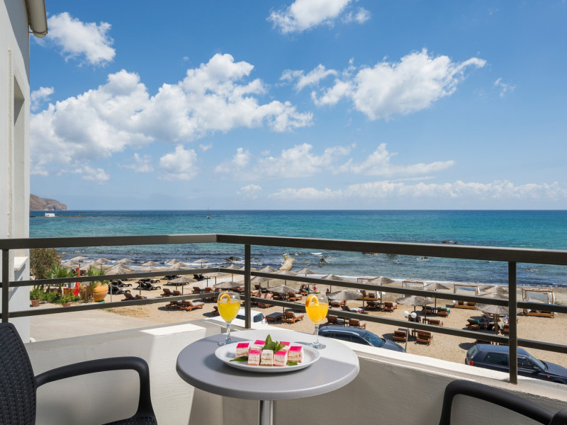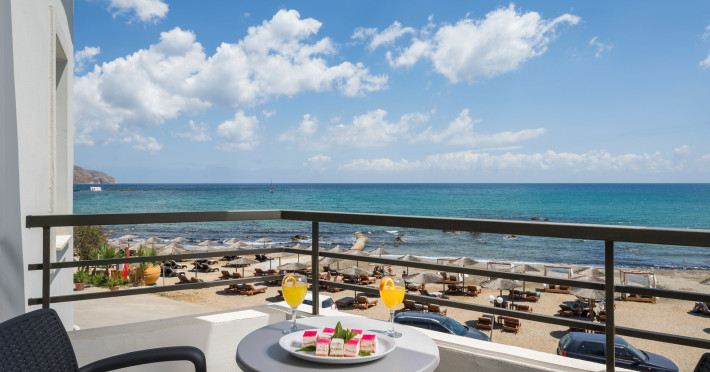 The guests can swim in the shimmering waters of the outdoor swimming pool, lounge at the relaxing pool area and enjoy the sun in bliss. Enjoy all meals of the day in the laid-back atmosphere of Mare Boutique’s Restaurant facing the endless blue of the Cretan sea!! . The hotel’s main restaurant serves everything from American breakfast to sumptuous buffet-style lunch and dinner, or you can cool down with refreshing beverages, delicious ice creams, coffee and fresh snacks right next to the hotel’s sandy beach – from early in the morning till late in the evening.