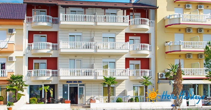 Mare del Sol este situat in Paralia Katerini la aproximativ 70m de plaja amenajata cu umbrele si sezlonguri gratuite (consumatia la bar fiind obligatorie) si la cateva sute de metri de centrul statiunii, unde se gasesc tavernele si barurile din zona.