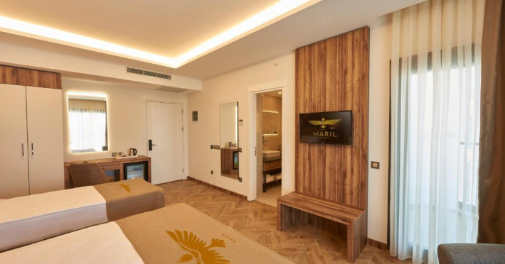 Camerele luminoase de la Maril Resort sunt dotate cu aer condiționat și Tv cu canale prin satelit. Oaspeții au la dispoziție serviciul de room service pentru a servi masa sau diverse băuturi. Unele camere au vedere la mare. În camere există baie cu cadă sau duș, foehn, articole de toaletă gratuite, precum și halate de baie și papuci. Oaspeții au acces gratuit la serviciul Wi-fi în camere. Curățenia in cameră se face zilnic. Proprietatea oferă camere pentru familie cu o suprafață mai mare și un număr mai mare de paturi față de cele standard.