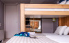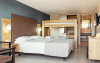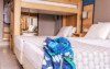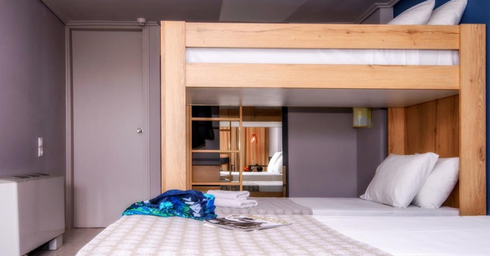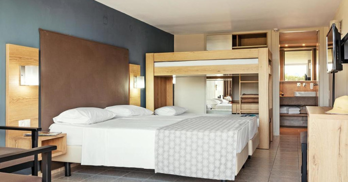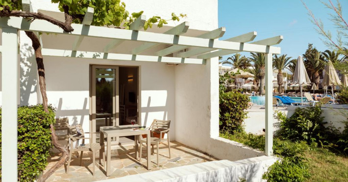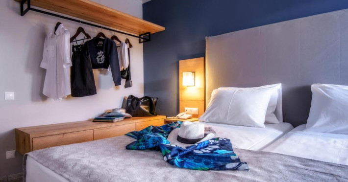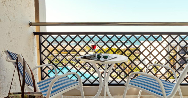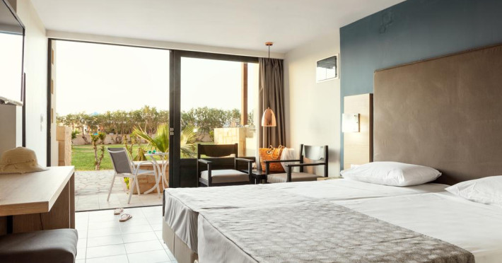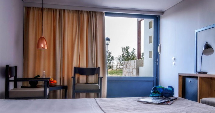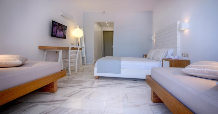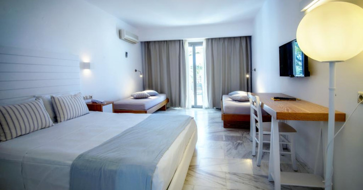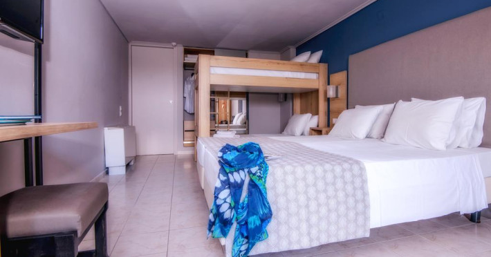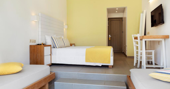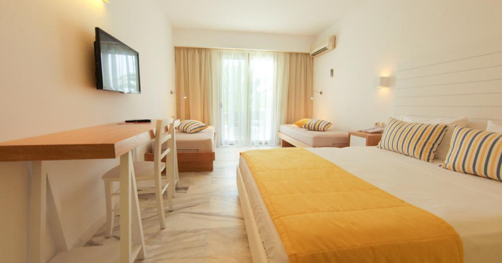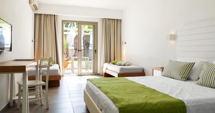 Sunt disponibile 200 camere. Unele camere au balcon cu vedere la mare sau la piscină. Camerele confortabile de la Marina Beach Hotel au pardoseală de gresie/ marmură, aer condiționat, Tv cu canale prin satelit și seif. Fiecare cameră oferă cană-fierbător și mașină pentru prepare cafea sau ceai. Oaspeții pot solicita serviciul de room service pentru a servi masa sau diverse băuturi. În camere există baie cu cadă sau duș ce are în dotare foehn și articole de toaletă gratuite. Oaspeții au acces gratuit la serviciul Wi-fi în camere. Curățenia in cameră se face zilnic. Fiecare unitate de cazare are frigider. Proprietatea oferă camere pentru familie cu o suprafață mai mare și un număr mai mare de paturi față de cele standard.