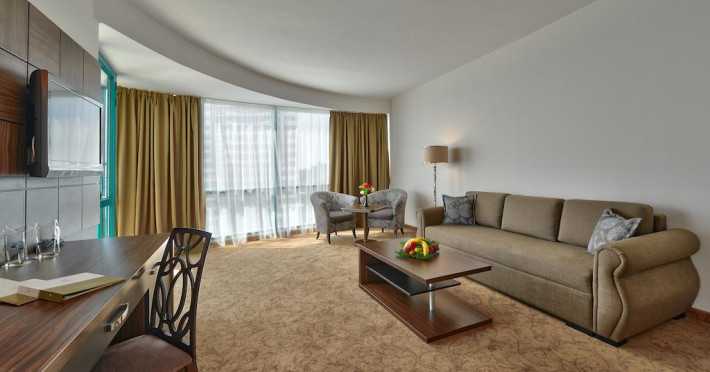 Hotelul dispune de receptie 24 h, room service, restaurant a-la-carte (in afara hotelului), parcare nesupravegheata contra cost (locuri limitate), birou de schimb valutar, internet WiFi in camere si unele dintre spatiile publice, magazine, buticuri, restaurant, cafenea/bistro, bar/pub, lobby bar, pool bar, sală de fitness, centru pentru tratamente medicale și cosmetice, centru de afaceri, sală de conferințe, camera pentru depozitarea bagajelor, saună, masaj, solar, jacuzzi, spa, coafor, salon de înfrumusețare, piscină exterioară și interioară, prosoape de plajă cu depozit, spălătorie, programe de animație (6 zile/săptămână).