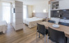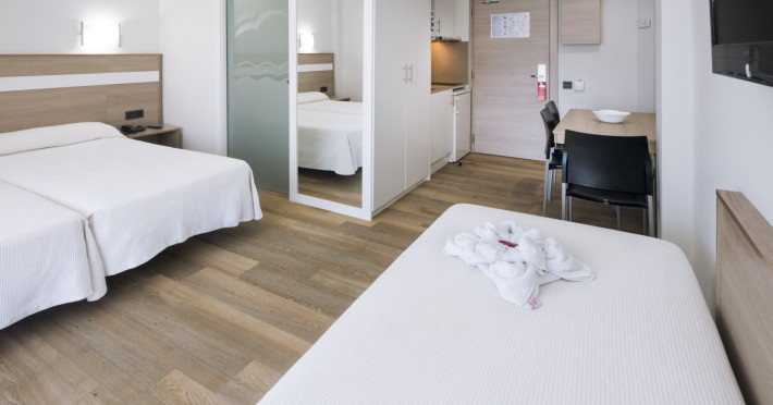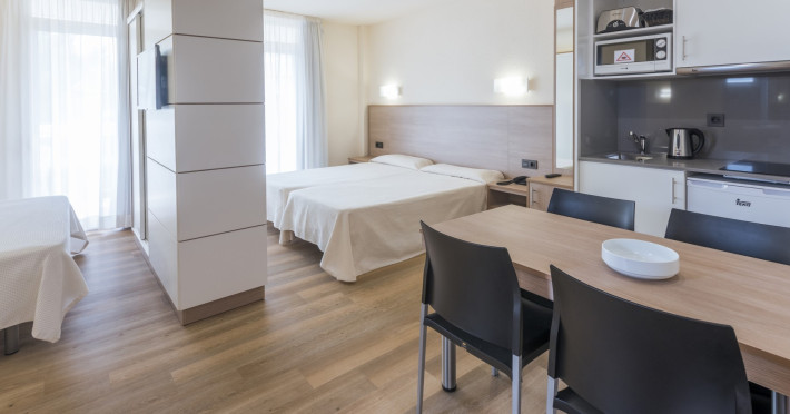 The apartment hotel comprises a total of 82 apartments set over six floors. Facilities on offer include an air-conditioned foyer with 24-hour reception, safes, a currency exchange counter, and lifts. The hotel café offers all guests a range of culinary specialities, and there are on-site parking spaces available to those arriving by car (charges apply)..This attractive apartment hotel is centrally located, just 15 minutes on foot from the sandy beach. Countless shops as well as restaurants, bars, and nightclubs can be found in the immediate vicinity, and the nearest public transport stop is only 50 m away. The railway station lies 2.5 km from the hotel, and it is 12 km to Reus airport..The tastefully furnished apartments offer en suite bathroom facilities with a shower, bathtub, and hairdryer, a combined living room/ bedroom, a direct dial telephone, and satellite/cable TV. A kitchenette with fridge, air conditioning, central heating, a hire safe, and a balcony or terrace are also provided as standard in all the accommodation units..Guests may select their breakfast, midday and evening meals from varied buffets. Guests are able to book either half-board or full board stays.MasterCard and VISA are accepted as methods of payment..There is a swimming pool with a childrens area and poolside snack bar as well as sun loungers and parasols laid out ready for use in the well-kept outdoor complex of the hotel. Sun loungers and parasols are also available on the beach. Guests may further relax in the sauna or the solarium, while sports enthusiasts can try windsurfing, table tennis, aerobics, basketball, billiards, miniature golf, golf, or a workout in the gym. An entertainment programme provides additional amusement for all guests.Datorita dinamicitatii domeniului disponibilitatea ofertelor se modifica de la un moment la altul. De aceea ofertele sunt valabile in limita locurilor disponibile. Agentia nu este responsabila pentru eventualele neconcordante care pot aparea intre informatiile privind tarifele si alte detalii din site si informatiile primite in agentie. In aceste cazuri vor avea prioritate, intotdeauna, informatiile primite in agentie.