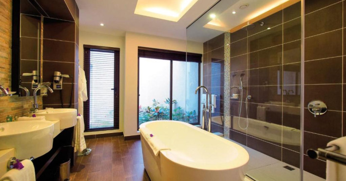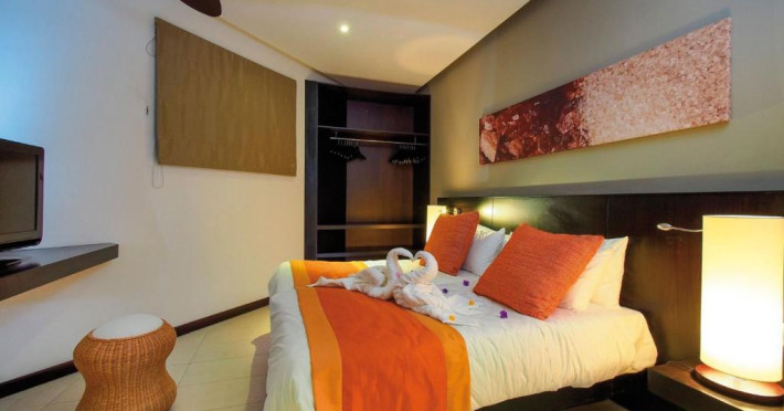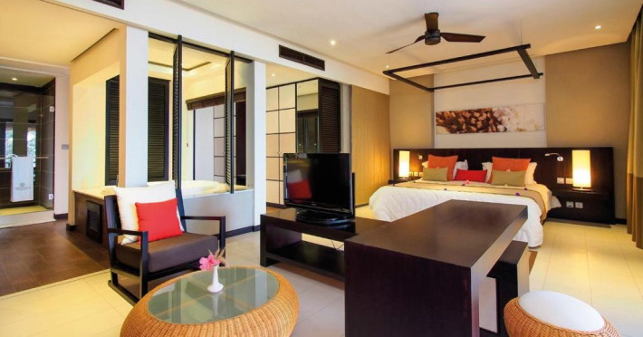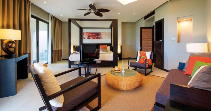 The modern and elegant units offer a balcony or terrace with views of the Indian Ocean. All rooms come complete with a seating area, flat-screen TV, minibar and air conditioning. Extras include tea-and-coffee-making facilities and each has an en suite bathroom with an oval bathtub, shower and double basins.