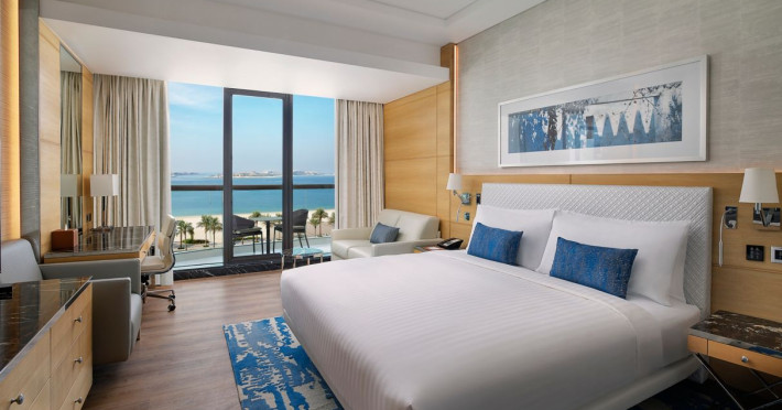 41 sqm, 1 King bed (190 cm x 200 cm) and sofa bed (110 cm x 180 cm). View is subject to availability - to the Palm Jumeirah (city view) and partial sea view OR sea view. Maximum occupancies 3 adults or 2 adults and 2 kids below 12 y.o. Baby cot can be placed in the room. M Club Lounge access.