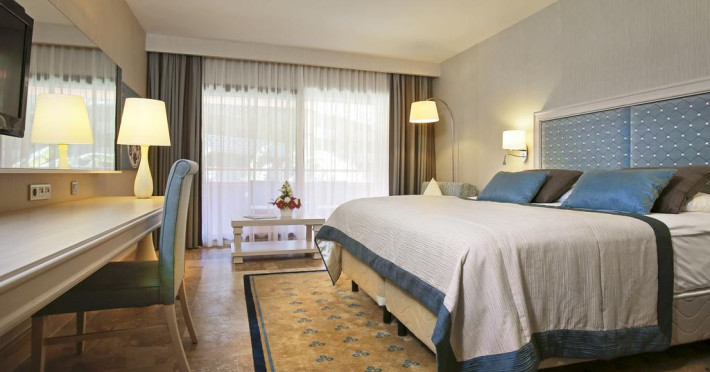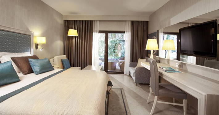Hotelul are un numar total de 545 camere in bungalow-uri (cu 3 sau 4 etaje): camere superioare (36 mp, un dormitor, o baie, max 2+2pax), camere Superior Deluxe (36 mp, un dormitor, o baie, max 2+2pax), camere Superior Deluxe Family (44 mp, doua dormitoare cu usa intre ele si o baie, max 4 pax), camere Superior Family (44 mp, doua dormitoare cu usa intre ele, o baie, max 4 pax), camere Duplex (50 mp, doua etaje, fara usa intre etaje, o baie, max 4 pax), Premium Suite (180 mp, doua dormitoare, doua bai, una cu Jacuzzi, bucatarie, living), 1 Honeymoon Suit si 1 Presidential Suit. Toate camerele au balcon sau terasa, cu vedere la gradina, baie cu cada, dus si uscator de par, aer conditionat, telefon direct, TV prin satelit si canale de muzica, mini-bar in camerele Deluxe (4 sticle de apa plata realimentat zilnic), mini-bar in camerele Superior (4 sticle de apa plata realimentat zilnic), seif, TV prin satelit si programe de muzica, conexiune la internet Wi-Fi, marmura si mocheta, balcon sau terasa.