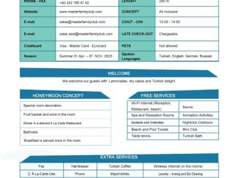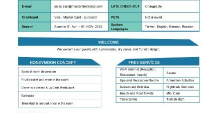Descriere: Master Family Club este un hotel recomandat atat familiilor cu copii cat si cuplurilor, oferind numeroase facilitati.Hotelul se intinde pe o suprafata de aproximativ 70.000 mp.Tip masa: All inclusive.