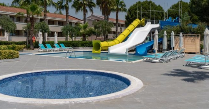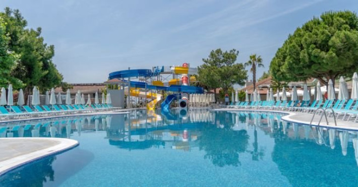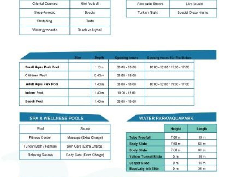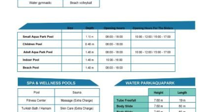 Facilitati hotel: Oaspetii pot beneficia de un restaurant principal, doua restaurante A la Carte, baruri, piscina exterioara, piscina interioara, sezlonguri si umbrele, tobogane, centru fitness, centru spa, programe de animatie si divertisment, tenis de masa.