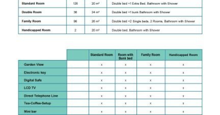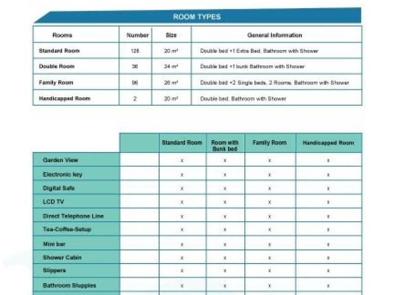 Dotari camere: Hotelul are un total de 260 de camere, toate dotate cu aer conditionat, TV, seif (contra cost) Wi-fi (contra cost), facilitati pentru preparare ceai sau cafea, minibar, baie privata, uscator de par, balcon.