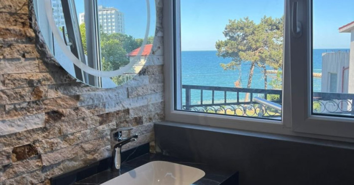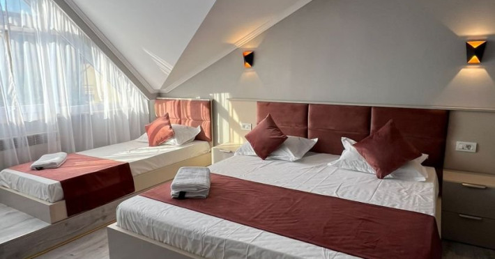 Apartamentul triplu cu doua dormitoare, terasa si vedere la mare dispune de doua dormitoare, fiecare cu pat matrimonial (180x200) si un pat single (90x200), terasa. Dormitoarele sunt separate cu usa si au fiecare tv si aer conditionat. Suprafata 60 mp