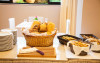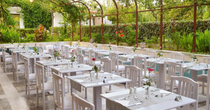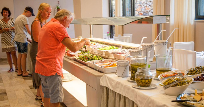 La May Beach oaspeții au la dispoziție un restaurant care servește mâncare în stil bufet. Preparate din bucătăria grecească și internațională așteaptă să fie degustate în fiecare zi la micul dejun, prânz și cină. Masa poate fi servită atât în interior, cît si în aer liber, pe terasă, în funcție de vreme. Oaspeţii pot avea diverse băuturi răcoritoare sau alcoolice la bar. Pentru cei care doresc să ia masa în natură, May Beach pune la dispoziție o zonă de picnic.